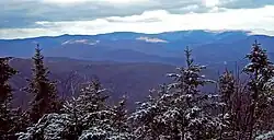 Panther's forests are for the most part typical of the Catskills, with beech-birch-maple northern hardwood forests on its lower slopes giving way to boreal forests of balsam fir and red spruce above 3,500 feet (1,100 m) on the mountain. While the lower slopes were logged in the 19th century, particularly for Eastern hemlock bark and its tannin, the upper mountain remains in first growth. According to Catskill forest historian Michael Kudish, there is a rare virgin spruce grove near the summit. There are also two open areas visible from the summit on a knob known as Beech Flat, one of about 2 acres (0.81 ha) at 2,740 feet (840 m) and another of 5–7 acres (2.0–2.8 ha) at 2,848 feet (868 m), are totally natural, resulting from the absence of soil in those areas.[5]