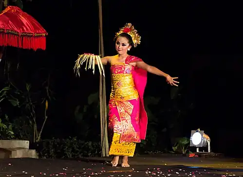 The dancers – always young women – come onstage carrying a metal (usually silver or aluminium) dish with incense and flowers in it.[8] These dancers, numbering two or more, wear layered clothing, decorated with a golden pattern called prada. Around their bodies they wear a kamben (sarong), as well a tightly wrapped cloth which covers from their chest to their waist. On their heads they wear golden headdresses and frangipani flowers.[10]