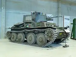 The Panzerkampfwagen 38(t), originally known as the Českomoravská Kolben-Daněk (ČKD) LT vz. 38, was a tank designed during the 1930s, which saw extensive service during World War II.[3] Developed in Czechoslovakia by ČKD, the type was adopted by Nazi Germany following the German occupation of Czechoslovakia.[3] With the German Army and other Axis forces, the type saw service in the invasions of Poland, France and the USSR.[3] Production ended in 1942, when its main armament was deemed inadequate.[4] In all, over 1,400 Pz. 38(t)s were manufactured.[4] The chassis of the Pz. 38(t) continued to be produced for the Marder III (1942–1944) with some of its components used in the later Hetzer (Jagdpanzer 38, 1944–1945) tank destroyer and its derivative vehicles.