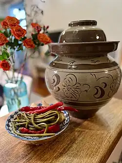 The production of homemade Sichuan pao cai utilizes specially designed jars.[12] The top of the jar is surrounded by an eave-like circle notch and the lid is upside down like a bowl at the top of the jar. The notch is filled with water to seal the jar and create an anaerobic environment for lactic acid bacteria.[12] The gas produced by microbes during the process of fermentation inside the jar can escape the jar through dissolving in the water.[12] Many local families in Sichuan have pao cai jars at home.[12]