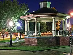Paola's town began with the Indian tribes who once lived in the area and used it as their primary gathering place.[8] Prior to their exile to Oklahoma, Indian leader Baptiste Peoria gave this area to the Paola Town Company (of which he was a member) as a treaty of peace. The Paola Town Company later gave the square to the City of Paola, with the provision that no building be built on it.[7] In 1867, the original gazebo was put on the square, and was a bandstand. In the 1800s the square was used as a track for racing horses in addition to serving as a central point for parades, celebrations, and other community events. In 1913, a new Victorian-style gazebo was built, designed by George Washburn. Paola Park Square is used for community events each year. The 1913 gazebo is still used, and near the gazebo is a bust of Paola founders Baptiste Peoria and his wife, Mary Ann Isaacs Dagenet. It is the only known monument in the United States featuring a Native American and his wife. A fountain in the center of the square was also added.[8]
