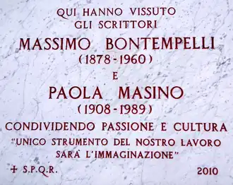 In 1950 Paola and Massimo Bontempelli left Venice and returned permanently to Rome: Paola collaborated with Rai, composed opera librettos, devoted herself to translations, continued to write the Appunti notebooks and, after Bontempelli's death in 1960 , she worked on Massimo's writings for a two-volume edition of his works. She also kept a diary, translated Balzac, Valery Larbaud, Jean Cocteau, Hector Malot, JA Barbey d'Aurevilly, Geneviève Tabouis, Madame de La Fayette and Stendhal and composed a long autobiography entitled "Album di abiti", which she inserted into the Appunti notebooks that she had been writing. Her last work is the poem Ninna nanna , published in 1966 by the magazine « La Battana »: then, there is silence and Paola Masino dies, forgotten, on 27 July 1989. The volumes "Colloquio di notte" were published posthumously in 1994, which collects the stories published in magazines in the 30s and 40s, as well as three unpublished stories, "Io, Massimo e gli altri-autobiografia di una figlie del secolo" in 1995, "Cinquale ritrovato" in 2004, which collects three previously published stories and in 2015 the volume "Album di abiti". In 2001 the Arnoldo and Alberto Mondadori Foundation published an important biographical catalogue, on the occasion of a large Exhibition and a Conference on Paola, inaugurated by the President of the Republic Carlo Azeglio Ciampi at the Casa delle Letterature in Rome. On July 16, 2010, the Municipality of Rome placed a commemorative plaque on the house at Viale Liegi 6, Rome, where Paola Masino lived until her death. She is buried in Rome in the Cimitero Flaminio.