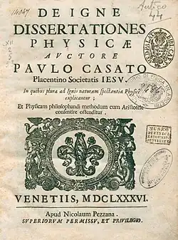Born in Piacenza to a Milanese family, he joined the Jesuits in 1634. From 1636 to 1637 he studied physics and metaphysics at the College of Ferrara. One of the most famous Jesuits scientists of the time, Niccolò Cabeo (1586–1650), was teaching at Ferrara when Casati arrived there.[3] In 1640 he moved to the Roman College, where he studied theology for four years. He was thes sent to teach logic at the Jesuit college of Bologna. Bologna Jesuits had developed a strong program of experimentation, such as with falling bodies. During his time in Bologna, Casati frequented the scientific circle gathered around Giovanni Battista Riccioli and Francesco Maria Grimaldi. In Bologna Casati befriended the mathematician Giannantonio Rocca (1607-1656), a disciple of Cavalieri and one of the first Italian supporters of Cartesian philosophy.[4] In 1650, Casati moved to Rome, where he assumed the position of professor at the Roman College.[5] He was given the chair in mathematics after teaching philosophy and theology.