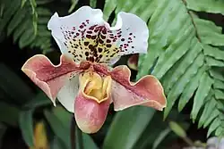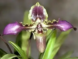 Paphiopedilum, often called the Venus slipper, is a genus of the lady slipper orchid subfamily Cypripedioideae of the flowering plant family Orchidaceae. The genus comprises some 80 accepted taxa including several natural hybrids. The genus is native to Southeast Asia, the Indian Subcontinent, southern China, New Guinea and the Solomon and Bismarck Islands. The type species of this genus is Paphiopedilum insigne.[2][3][4]