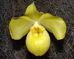 Paphiopedilum armeniacum is a species of flowering plant in the orchid family, Orchidaceae. It is known commonly as the apricot orange paphiopedilum[1] and golden slipper orchid.[2] It is endemic to China, where it occurs only in Yunnan.[1] It is also cultivated and has won prestigious awards at flower shows.[3]