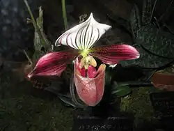 Paphiopedilum purpuratum is a species of orchids found from southern China to Hainan Island. The species was discovered on Hong Kong Island in 1850.
