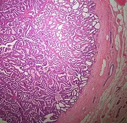 The microscopic histopathology of typical PDCIS lesions (refer to adjacent high-power photomicrograph) prepared with a hematoxylin and eosin stain consists of mammary ducts that have papillary fronds (i.e. thin, finger-like or leaf-like structures) lined with one or several layers of neoplastic, columnar-shaped epithelial cells (i.e. tall, narrow cells with their nuclei close to the site of their ductal attachment).[4] The fronds have branching fibrovascular cores. Epithelial cells lining the fronds' inner surfaces commonly form solid, cribriform (i.e. large nests of cells perforated by many rounded, variably sized spaces), or micro-papillary patterns. There may be a second population of epithelial cells lining the papillae that have abundant clear cytoplasm in addition to the usual neoplastic epithelial cells which line the papillae. These cells, which are not myoepithelial cells, have been termed globoid cells.[7] They have eosinophilic cytoplasm (i.e. pink or red cytoplasm due to its uptake of eosin stain).[6] PDCIS tumors with these cells have been termed dimorphic variants of PDCIS.[3] Myoepithelial cells are typically present at the periphery of the fronds but absent within the involved ducts.[4][7] The presence of a fibrous capsule and/or absence of peripherally located myoepithelial cells are strong indicators that the tumor is an ESP rather than a PDCIS.[3] PDCIS tissues may also contain areas of "Comedo-type necrosis", i.e. areas where dead cells have accumulated.[6]