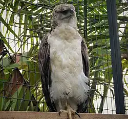 The Papuan eagle (Harpyopsis novaeguineae) is a large bird of prey.[2] It is also known by several other names, including Papuan harpy eagle, New Guinea eagle, New Guinea harpy eagle, or kapul eagle, the latter name from the local name for a usually arboreal marsupial that the eagle is known to regularly hunt.[3][4] This is an endemic species to New Guinea, and it can occasionally be found throughout the island.[1] This is a forest-dwelling species, usually occurring in mature rainforest.[5] The Papuan eagle is a fairly little-known species for a large eagle; however, it is known to prey on a wide range of prey, probably by and large mammals and birds from small to quite large sizes.[2][4] Unique amongst eagles, the Papuan eagle is a surprisingly fast and agile terrestrial avian predator and is capable of chasing down prey on the forest floor.[6] What little study has been conducted about its breeding habits suggests it nests in a large forest tree, perhaps every other year.[7] The Papuan eagle is probably naturally scarce, but it is under the threat of habitat destruction by deforestation, as well as hunting. Due to its small and declining population, the species has been classified as vulnerable by the IUCN.[1]