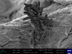 | A scanning electron micrograph of a jumble of Paraburkholderia solitsugae cells in full strength tryptic soy broth displayed against a backdrop of cellulose fibres | |
