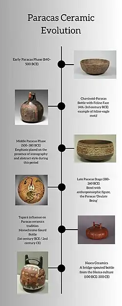 The middle Paracas period (500–380 BCE) included the time spent constructing the Paracas culture, which is distinctive from Chavín culture.[7] In this period, the Paracas expanded trade networks and continued to build their religious framework that supported the building of burials consisting of a large number of ceramics.[7] The late Paracas phase (380–260 BCE) was linked with the homogenization of Paracas ceramics and the influx of people visiting the huacas in the southern coast of Peru.[7] This period involved the growing presence of the "Oculate Being," a creature that was a major part of the Inca valley.[7][14]