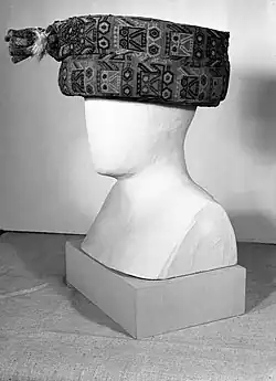 The dry environment of southern Peru's Pacific coast allows organic materials to be preserved when buried.[18] Mummified human remains were found in a tomb in the Paracas peninsula of Peru, buried under layers of cloth textiles.[19] The dead were wrapped in layers of cloth called "mummy bundles". These bodies were found at the Great Paracas Necropolis along the south Pacific coast of the Andes.[20] At the Necropolis there were two large clusters of crowded pit tombs, totaling about 420 bodies, dating to around 300–200 BCE.[21] The mummified bodies in each tomb were wrapped in textiles.[10] The textiles would have required many hours of work as the plain wrappings were very large and the clothing was finely woven and embroidered. The larger mummy bundles had many layers of bright colored garments and headdresses.[19][22] Sheet gold and shell bead jewelry was worn by both men and women, and some were tattooed.[23] The shape of these mummy bundles has been compared to a seed, or a human head.[18]