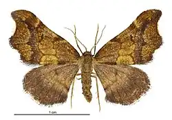 Female. — 20 mm. Forewings moderate, costa sinuate in middle, apex almost acute, hindmargin deeply excavated on upper half and more shortly on lower third, so as to project bluntly below middle; yellow-ochreous, irregularly mixed with brown and purplish; veins clearly marked with fuscous; two slender ochreous-brown transverse lines, dilated on costa, first before middle, bent inwards near costa, second beyond middle, almost straight; beyond second a broad purplish shade, except near costa, dilated beneath to reach hindmargin; hindmargin purple: cilia white on excavations. Hindwings moderate, hindmargin shortly sinuate near inner angle; pale ochreous mixed with fuscous and purplish; a fuscous transverse fine before middle; a very broad purplish hindmarginal band.[4]
