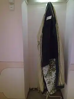 Paranja /ˈpærənˌdʒɑː/, paranji, or faranji[1] (from Arabic: فرنجية, romanized: faranjiyyah;[2] Tajik: فرنجی, фаранҷӣ, farançī; Uzbek: paranji; Russian: паранджа, romanized: parandzha) is a traditional Central Asian robe for women and girls that covers the head and body.[3][1] It is also known as "burqa" in Arabic. It is similar in basic style and function to other regional styles such as the Afghan chadari. The part that covered the face, known as the chachvan (Uzbek: chachvon; Russian: чачван) or chashmband (Tajik: چشمبند, чашмбанд, caşmʙand), was heavy in weight and made from horsehair. It was especially prevalent among urban Uzbeks and Tajiks,[4][5] but was not commonly worn by people in the mountainous regions of Tajikistan.[1] It was also worn during the Shaybanids' rule (c.1510–1600).[6]