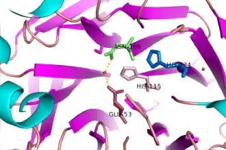 The study of this family of enzymes has been something of interest for a number of years now; however, the lack of identifying specific natural substrates and numerous physiological roles has made it difficult in determining mechanisms of action for the diverse number of reactions catalyzed by this enzyme family. One of the more studied mechanisms is the lactonase mechanism of Serum Paraoxonase-1. One of the proposed mechanism outlines the hydrolysis of 5-membered ring lactone substrates by serum Paraoxonase-1. PON1, as with PON2 and PON3, utilizes a catalytic calcium ion, which functions as an oxy-anion to stabilize substrate and reaction states. Additionally, this enzyme active site employs two histidine residues (His115 and 134) involved in proton transfers, a glutamic acid (Glu53) to stabilize reactive hydrogens, and an asparagine (Asn168) to stabilize transition states and intermediates in the active site.[15] The exact mechanism is still a subject of further research and it is suggested that the His115 residue is not necessary for the lactonase and arylesterase activity of the enzyme.[13]