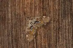 The wingspan is about 20 mm. There is a pattern of brown and white on the wings.