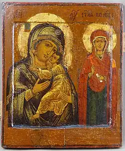 The most common idol was the sculpture of Paraskeva Pyatnitsa – not only for Russians, but also for neighbouring peoples.[4] The folklorist A. F. Mozharovsky writing in 1903,[a] noted that in the chapels "in foreign areas" there were "roughly carved wooden images of Saints Paraskeva and Nicholas ... All carved images of Saints Paraskeva and Nicholas have the common name of Pyatnits ['Friday']".[5] Sculptures were widespread among the Russians. According to a 1908 historical sketch of Sevsk, Dmitrovsk and Komaritskaya volost by Svyatsky, commonly, Paraskeva were:[6]: 22 "a painted wooden statue of Pyatnitsa, sometimes in the form of a woman in oriental attire, and sometimes in the form of a simple woman in poneva [traditional skirt] and lapti [bast shoes] ... placed in churches in special cabinets and people prayed before this image".
