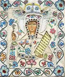 The image of Paraskeva Pyatnitsa according to folk beliefs is different from the iconographic image, where she is depicted as an ascetic-looking woman in a red maforiya. The carved icon of Paraskeva Pyatnitsa from the village of Illyeshi is widely known. It is revered in the Russian Orthodox Church as a miracle worker and is housed in the Trinity Cathedral of the Alexander Nevsky Lavra in St. Petersburg.[3]