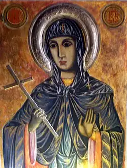 In the 14th century, Bishop Euthymius of Tarnovo (1332-1402) wrote a notable biography of Paraskeva - "Hagiography of Saint Petka of Tarnovo".[9] The bishop's work was inspired from the Greek vita of Saint Paraskeva of the Balkans, written by deacon Basilikos in 1150 on the request of the Patriarch of Constantinople, Nicholas IV Mouzelon. Hagiographies were also written by Metropolitan Mattheos of Mira in 1605, Metropolitan Varlaam of Moldavia in 1643, Nikodimos the Athonite (19th century), and Romanian bishop Melchisedec of Roman in 1889.[10] Some modern Romanian theologians published studies about Paraskeva: Gheorghe Păvăloiu (1935), Arhimandrite Varahil Jitaru (1942), D. Stănescu (1938), M. Țesan (1955), Scarlat Porcescu, and Mircea Păcurariu.
