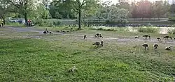 The park features a 1 square kilometre (0.39 sq mi) artificial lake, which serves as a retention basin, which is surrounded by wooded areas. A large hill overlooks the lake, and offers views of the surrounding area.[1]