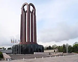 The base is circular and plated with black granite. Above rise five narrow arches covered with red granite. Inside the base there is a rotunda covered in red granite plates; the ceiling is decorated with a golden mosaic. Prior to the Romanian Revolution of 1989, the rotunda contained the crypts of Communist leaders Petru Groza, Gheorghe Gheorghiu-Dej, and Constantin Ion Parhon. In the semicircle around the monument were crypts containing the remains of a number of socialist militants, such as Ștefan Gheorghiu, Ion C. Frimu, Mihail Gheorghiu Bujor, Leontin Sălăjan, Dumitru Petrescu, Alexandru Moghioroș, Gheorghe Cristescu, Gheorghe Stoica, Petre Constantinescu-Iași, Ștefan Voitec, Gheorghe Petrescu, Teohari Georgescu, Chivu Stoica, Gheorghe Vasilichi, Ion Pas, Constantin Doncea, Petre Borilă, Athanase Joja, Lucrețiu Pătrășcanu (after his rehabilitation), Ioan Gheorghe Olteanu, Grigore Preoteasa, Lothar Rădăceanu, Iosif Rangheț, Alecu Constantinescu, Gheorghe Petre, Ilie Pintilie, Bela Breiner, Leonte Filipescu, and Constantin Dobrogeanu-Gherea.[4] To the right of the monument was a hemicycle containing the funeral urns of Communist leaders, such as Vasile Luca, Ștefan Foriș, Iosif Chișinevschi, Ana Pauker, Mihail Roller, and Remus Koffler,[4] and Communist militants, including Gheorghe Vasilescu-Vasia, Constantin David, Ada Marinescu, Panait Mușoiu, Barbu Lăzăreanu, Simion Stoilow, and Mihail Macavei.[5]