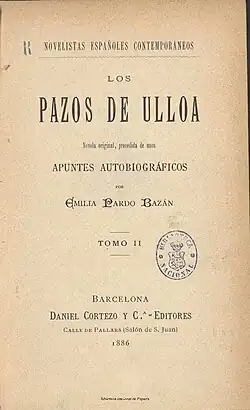 - ^ Her full name was Emilia Antonia Socorro Josefa Amalia Vicenta Eufemia Pardo Bazán y de la Rúa Figueroa, II Pontifical Countess of Pardo-Bazán and I Countess of the Tower of Cela. See José-Domingo Vales Vía, «Doña Emilia Pardo-Bazán y su efímero título nobiliario.» Anuario Brigantino, 2005, n.º 28, págs. 265-276. ISSN 1130-7625