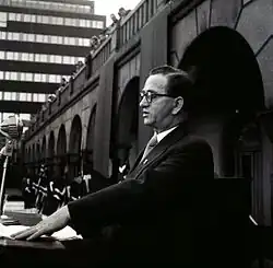 He became the deputy leader of the Confederation of Trade Unions from 1950 to 1965 and leader from 1965 to 1969.[2] He was elected leader as a compromise candidate after Konrad Nordahl and only served one term. During his time, the trade union made a collective home insurance contract available for members.[1]