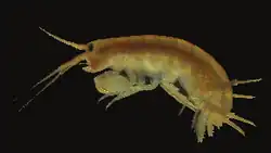 Parhyale hawaiensis is a detritovore that has a circumtropical, worldwide, intertidal, and shallow-water marine distribution,[1][2] and it may occur as a species complex.[3] It has been reported to occur in large populations (more than 3,000 per square metre) on decaying mangrove leaf material in environments subjected to rapid changes in salinity.[4] The ability to tolerate rapid temperature and osmotic changes allows this species to thrive under typical laboratory conditions. It is a robust species and is being considered for aquaculture.[5]