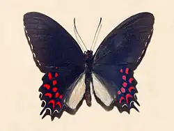 Parides photinus has a wingspan reaching 90–100 millimetres (3.5–3.9 in). Adults are black with the hindwing having a blue-green metallic sheen, especially in the male. There are no wing bands. Two rows of red spots are found along the hindwing margin.[1][2] The submarginal spots are strongly arched except for the upper two or three and the anal one; the latter is distinct on the upperside only in the female. The hindwings have short tails. The undersides are similar to the upsides. The larvae feed on Aristolochia grandiflora and A. asclepiadifolia.[3][4] A full description is provided by Rothschild, W. and Jordan, K. (1906)[5]