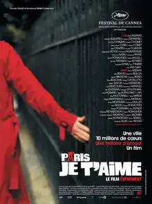 The film premiered at the 2006 Cannes Film Festival on 18 May, opening the Un Certain Regard selection.[7] It had its Canadian premiere at the 2006 Toronto International Film Festival on 10 September and its US premiere in Pittsburgh, Pennsylvania, on 9 April 2007.[8] Paris, je t'aime was released theatrically in France on 21 June 2006 by La Fabrique de Films, in Switzerland on 13 September 2006 by Ascot Elite Entertainment Group and in Germany on 25 January 2007 by Senator Film.[9] First Look Pictures acquired the North American rights in September 2006,[10] and the film opened in New York City on 4 May 2007, before expanding to other American cities including Los Angeles on 18 May.[11]