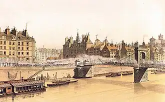 While Paris during the Restoration had many beautiful monuments and majestic squares, the neighborhoods of the city between the monuments were dark, crowded and crumbling. An English traveller who visited Paris in 1814, at the very beginning of the Restoration, wrote: "The ordinary buildings of Paris, as every traveller has observed and as all the world knows, are in general mean and uncomfortable. The height and gloomy aspect of the houses; the narrowness of the streets, and the want of pavement for foot passengers, convey an idea of antiquity, which ill accords with what the imagination had anticipated of the modern capital of the French Empire."[17] Upper class Parisians began moving to new residential neighborhoods that were created in the north and west; the Quartier Francois I near the Champs-Élysées in 1823, and the quartier Saint-Vincent-de-Paul and quarter de la Europe built in the north in 1824. They had wider streets, sidewalks, and houses modeled after the squares and town houses of London. They also moved to some of the villages outside the edge of the city, particularly Passy, and Beaugrenelle. By 1830, the village of Passy had become part of the city, a main street, rue de Passy, lined with three and four story buildings. At the same time, the older neighborhoods of the city, in the center the east. and grew more crowded every year. The neighborhoods of Arcis and Saint-Avoye, in the modern third arrondissement, had a population density of eight hundred persons per hectare in 1817, eight hundred fifty and 1831, and nine-hundred sixty in 1851, which amounted to nearly one hundred thousand persons per square kilometer.[18]