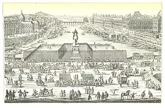 Louis XIV distrusted the Parisians; when he was young he had been forced to flee the city twice, and he did not forget it. He moved his residence from the Tuileries Palace to the Palace of Versailles in 1671, and moved his entire court to Versailles in 1682. But while he disliked the Parisians, he wanted Paris to be a monument to his glory; he declared in 1666 that he wished to "do for Paris what Augustus had done for Rome."[1] He decorated the city with new squares and public buildings; the Collège des Quatre-Nations (1662–1672); the Pont Royal in 1685, and in the same year began construction of two new monumental squares: Place des Victoires and Place Louis le Grand (now Place Vendôme). He also began the Hôtel des Invalides (1671–1678), a residence and hospital for wounded soldiers. In 1699, a monumental equestrian statue of the King was dedicated in the center of the place Vendôme. During his reign, Louis XIV spent more than 200 million livres for new buildings, of which ten percent was spent in Paris; ten million for rebuilding the Louvre and the Tuileries; 3.5 million for the new factories of Gobelins and the Savonnerie; and a little more than 2 million for Les Invalides.[2]
