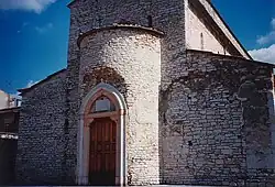 The church has a characteristic plan with the space divided into three naves, with the central one twice as wide as the side naves. The dimensions of the plan show a remarkable balance of the building; in fact, the facade of the church is about half as wide (16 meters) as the two sides (32.5 meters). The eastern side, built probably in the 11th century and in distinct Romanesque style, consists of three apses, a major one in the center and two minor ones on the sides; the central apse has three splayed single lancet windows with round arches, while the two lateral ones have only one, of similar construction, but with small arches made of tuff. The wall consists of white stone ashlars assembled with mortar and arranged horizontally. On the western side, according to some scholars belonging to the original Lombard building, there is an additional apse, where the main entrance door in Gothic style and made of red and white limestone was carved already before 1840.[19] Above the apse, at the nave, two simple single-lancet windows are inserted.