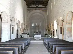 According to the expositions of scholar Wart Arslan[15] and historian Pietro Toesca,[16] considering the perfectly equal height of all the interior arches and the uniformity of the perimeter masonry, this building can be thought to derive (like many others that arose in Italy between the 10th century and the 11th century) from the Ottonian and Carolingian biapsidal churches of the 8th and 9th centuries, such as Saint-Riquier Abbey in Normandy, Fulda Abbey, Obermünster Abbey in Regensburg, Worms Cathedral, and many others. This theory was a major contributor to the dating of the Christian parish.[note 7]