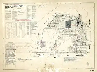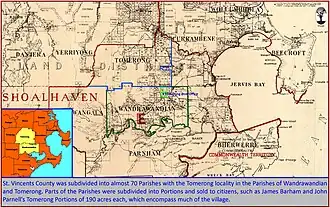 The Parish of Tomerong is one of about 76 parishes located in St Vincent County on the South Coast of New South Wales. Part of the colony of NSW around the settlement of Sydney, was divided into nineteen counties and St Vincent was the southernmost of these. Parish maps were used to record land holdings, ownership and use.[1] The parish is now located in the local government area of the City of Shoalhaven but was previously part of the Clyde Shire.
