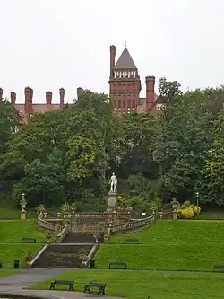 The main entrance and frontage, facing the railway station, in September 2014 | |