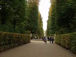 With the expansion of the site after the creation of more buildings, a 2.5 km long straight main avenue was built. It began in the east at the 1748 obelisk and over the years was extended all the way to the New Palace, which marks its end in the west. In 1764 the picture gallery was constructed, followed by the New Chambers in 1774. They flank the palace and open the alley up to rondels with the fountains, surrounded by marble statues. From there paths lead in a star pattern between tall hedges to further parts of the gardens.