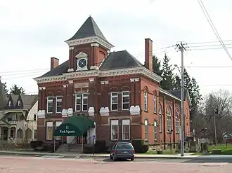 Park Square Historic District is a historic district located at Franklinville in Cattaraugus County, New York. The district encompasses the historic core of the village of Franklinville and include the landscaped village green, brickpaved streets, and the commercial or civic buildings fronting on the square or located immediately adjacent to it. Significant buildings range in date from 1828 to 1924 and reflect a variety of 19th-century and early 20th-century architectural styles including Queen Anne, Italianate, and Classical Revival styles. The village square was established in 1876. The district contains 21 contributing buildings and 2 contributing structures.[2]