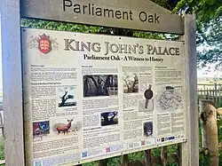 The tree stood around 1.5 miles (2.4 km) from King John's Palace at Clipstone.[2] King John stayed at the palace from around the time of his 1199 accession for hunting in Clipstone Park, part of Sherwood Forest.[3][4] Clipstone was one of the oldest parks in England, being enclosed for hunting since before the 1066 Norman Conquest.[4] The Parliament Oak is thought to date from around this time, being of comparable age to the Major Oak, which has been estimated to be 800–1000 years old.[5][6][7]
