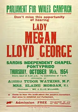 From 1950-to 1956, Parliament for Wales Campaign brought devolution back onto the political agenda. A cross-party campaign was led by Lady Megan Lloyd George, daughter of former Prime minister and campaigner for Welsh devolution, David Lloyd George who had passed away in 1945.[2][3] The Campaign for a Welsh parliament (Ymgyrch Senedd i Gymru) was formally launched on 1 July 1950, at a rally in Llandrindod. This event lead to the creation of a petition of 240,652 names calling for the establishment of a Welsh parliament, which was presented to the House of Commons by Megan Lloyd George in 1956.[1] This was rejected by the UK government. Petitions were also presented to the House of Commons for a Secretary of State for Wales which were also rejected. Following the pressure for a Welsh parliament, the UK government instead formed the Council for Wales and Monmouthshire in 1948 as an advisory body to the UK government composed of UK government-appointed members, but no elected members.[2][3]