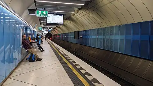 The station platforms were constructed using tunnelling methods. A pilot tunnel was made, enabling the walls to be constructed ahead of the main excavation. Each platform is an individual tunnel and is linked to the other platforms at the same level by several cross tunnels. That choice of design mean that the remaining pillar of rock between the tunnels too weak to support the required loads, so it was replaced with concrete.[1]