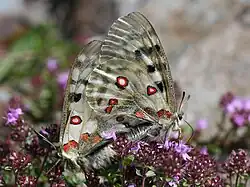 Parnassius apollo has a wingspan of 62–86 millimetres (2.4–3.4 in) in males, of 65–95 millimetres (2.6–3.7 in) in females. The Apollo butterfly shows a great deal of individual variation in the appearance, with an evident colour polymorphism. These very large, beautiful and conspicuous white butterflies are decorated with five large black eyespots on the forewing and two bright red or sometimes orange eyespots on the hindwing.[7] These striking red eyespots can vary in size and form depending on the geographic location of the Apollo butterfly, and the bright red colour often fades in the sun, causing the eyespots of older individuals to appear more orange.[8] The wings are shiny, with slightly transparent edges;[9] some individuals are darker (sphragismelanistic), a general phenomenon common in many butterflies. The caterpillars of this species are velvety black with orange-red spots along the sides.[7]