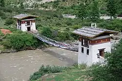 The Dungtse Lhakhang (a 15th-century temple) and the Ugyen Perli Palace are near the new bridge. Members of royal family lodge in the palace when in Paro.[2] Nearby is the old bridge and the Rinpung Dzong. Notable hotels include the Olathang Hotel built in an ornate style.[2]