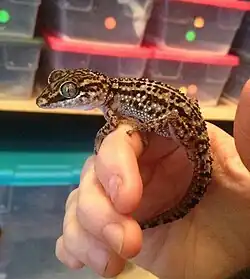 A 10-gallon tank can be used to house a single individual, or pair during the breeding season. The temperatures in the terrarium should be 85–90 °F (29–32 °C) on the hot spot and 70–75 °F (21–24 °C) on the cool side. Heavy misting in the morning and afternoon is appropriate for proper hydration. An average humidity peak of 80-90% when misting with a mid-day low of 45-50% works well.[4] Substrate can consist of peatmoss mix with potting soil or sand. Several cork pieces should be made available as these geckos are quite shy. Females lay eggs two at a time and these can be hatched at 80F and 80% humidity. Eggs hatch between 90 and 100 days.