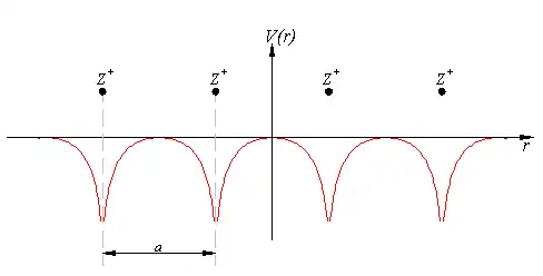 When talking about solid materials, the discussion is mainly around crystals – periodic lattices. Here we will discuss a 1D lattice of positive ions. Assuming the spacing between two ions is a, the potential in the lattice will look something like this: