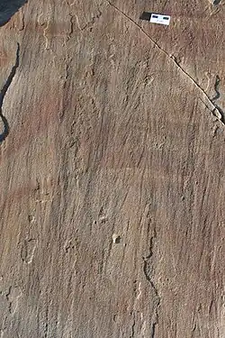 Parting lineation forms in very different depositional environments. The structure is most commonly found on the beach where it forms in flat, wet sediments due to swash. Parting lineation can also be created in dewatering tidal channels.[5] Geological formations like for instance the Old Red Sandstone or the Buntsandstein also give proof of the shallow marine character.[6] Parting lineation has even been described from turbidites.[7] Yet the structure is not only restricted to the marine environment, it can also form in river sediments, especially on point bars.