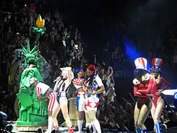 In 2013, Cyrus sang "Party in the U.S.A." during her performances held to promote Bangerz album. She performed the single on Jimmy Kimmel Live!,[90] 2013 iHeartRadio Music Festival in Las Vegas,[91] Today,[92] and the series of Jingle Ball concerts in December (including Jingle Bell Ball in Los Angeles).[93] In 2014 she included this song on her Bangerz Tour. While singing "Party in the U.S.A.", Cyrus has shorter blonde hair, a leotard with red, white, and blue sequins, a white cowboy hat, star-spangled boots, and a set of fake teeth during the performance. The backup dancers were dressed as American monuments.[94] Her performance received positive reviews from critics. Théoden Janes of The Charlotte Observer wrote, "She turned a verse of Party in the U.S.A. into a cool, cocky rap"[95] and John J. Moser of The Morning Call said that the performance resonated with the audience, even though Cyrus was lifted atop a huge pedestal.[96] Jane Stevenson of the Toronto Sun wrote, "She went for a big ending, with fireworks, confetti, an elevating stage and dancers dressed as Abe Lincoln, Mount Rushmore, the Liberty Bell and The Statue of Liberty for the final older song Party in the U.S.A."[97] A critic from Nashville Scene wrote, "Party in the U.S.A. was sung by Miley and screamed back by the people in the crowd. Cue red-white-and-blue confetti. Cue fireworks. Pack the Bangerz Tour up and put the circus back on the road. Fans in other cities need to party, too."[98] Cyrus also performed the song during the musical festival on June 21, 2014, Summertime Ball at Wembley Stadium of London, in front of 80,000 people.[99]