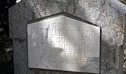 On 3 September 1915 Orozco's remains were placed in space 13 of the Masonic Holding Vault at Concordia Cemetery in El Paso, Texas, at the decision of his wife, dressed in a full Mexican general's uniform, with the Mexican flag draping his coffin, in front of three thousand followers and admirers. In 1925, his remains were returned to his home state of Chihuahua and interred in the Rotonda de las Personas Ilustres (Rotunda of Illustrious Persons), Panteón de Dolores, in Chihuahua.[16]