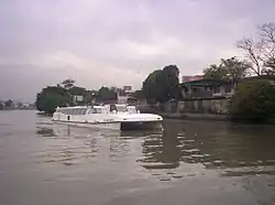 In 1990, Filipino shipping conglomerate Magsaysay Lines began operating Metro Ferry as an alternative mode of transport along the Pasig River to alleviate the traffic problem in Manila.[3] The Metro Ferry operated a route from Guadalupe in then-municipality of Makati down to Escolta Street in Manila, spanning a total length of 15 kilometers (9.3 mi) using river-side sheds as stations and piers constructed by the Philippine Ports Authority. The service, however, lasted only for a year, closing in 1991.[2] Its short-lived operation was beset by problems such as the proliferation of informal settlers along the route, water lilies, garbage and other debris clogging the waters. Aside from the foul odors permeating the environs, these problems also prevented the boats from traveling at normal speeds.