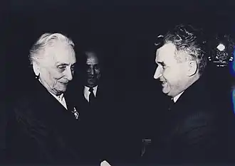 Sometime in 1965, Ibárruri flew from Paris to Dubrovnik to apologize to Josip Broz Tito as president of the PCE. On 17 May 1948, the Cominform, successor to the ECCI, had expelled Yugoslavia from the community of Socialist countries,[66] and Ibárruri had supported this censure. The 20th Congress of the Communist Party of the Soviet Union, held from 14 to 26 February 1956, had repudiated the charges against Yugoslavia. Now, Ibárruri came face to face with the man she had slandered. She began to apologise profusely, but Tito interrupted her, saying, "Do not vex yourself, Dolores, do not worry. I know very well how things worked in those days. I know it perfectly. Furthermore, believe me, I most likely would have done what you did had I been in your situation."[28] Ibárruri returned to visit Yugoslavia several times thereafter.[67] In late December 1965, the Presidium of the Supreme Soviet of the USSR awarded Ibárruri the Order of Lenin medal.[68] Between 1930 and 1991, a total of 431,418 decorations were given out, but only seventeen were awarded to foreigners.[69]