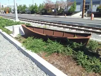 ![]() One of the installation's 38 weathered steel boat sculptures; this one was photographed at the Southeast 17th Avenue and Holgate Boulevard MAX Station in September 2015 | |